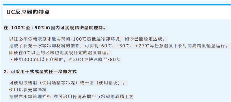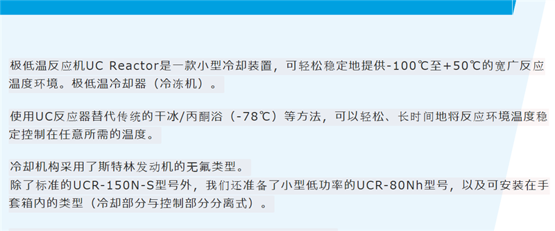 实验室超低温反应机无氟小型冷冻机UC Reactor 是一款小型冷却装置(超低温冷却器、冷冻机),能够轻松且稳定地提供从-100℃到+50℃的宽广反应温度环境。该装置可以替代传统的干冰/丙酮浴(-78℃)等,能够在任意温度下轻松、长时间稳定地控制反应环境温度。冷却机制采用非氟利昂的斯特林发动机类型。