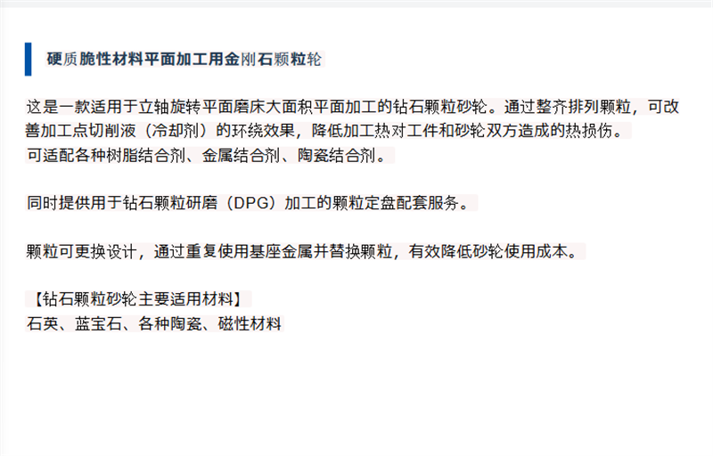 tokyodiamond硬质脆性材料加工金刚石砂轮专为立轴旋转平面磨床的大面积平坦化加工而设计。通过将丸片有序排列,可提升磨削液对磨削点的覆盖,降低加工热对工件与砂轮本身的热损伤。可对应树脂结合剂、金属结合剂、陶瓷结合剂等各种结合类型。